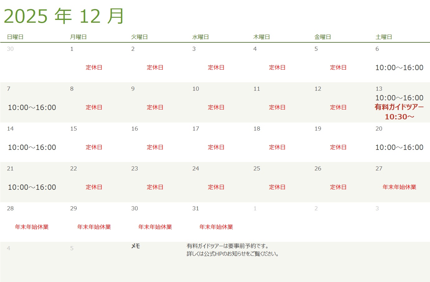 【見学施設・ショップ】2025年12月の営業日/有料ガイドツアーのお知らせ