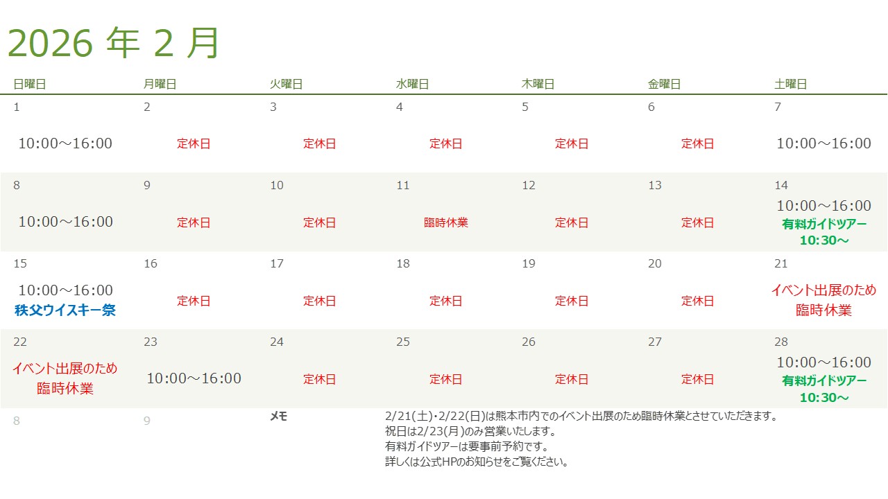 【見学施設・ショップ】2026年2月の営業日/有料ガイドツアーのお知らせ